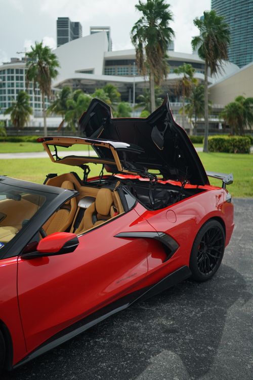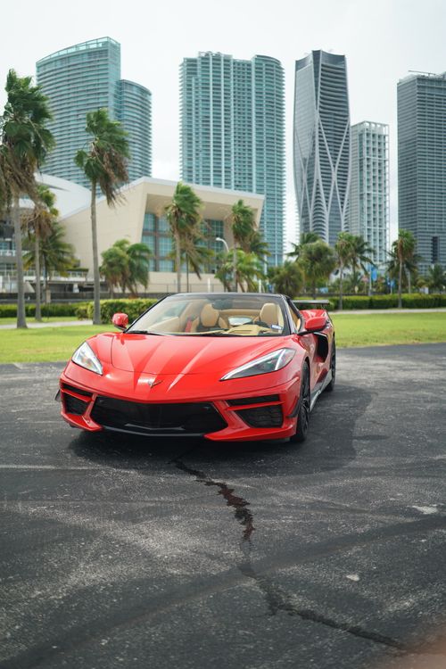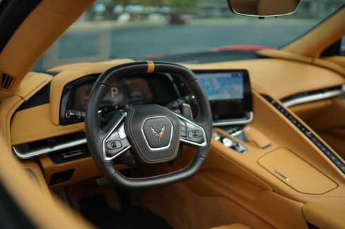 Unleash pure performance with the Corvette C8, now in a striking red-and-tan combination. With its mid-engine layout and sporty interior, this car is a true showstopper.